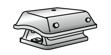 Das Maschinenlager besteht aus einer rechteckförmigen Haube sowie einem zweiten Metallteil mit gleich geneigten Seitenflächen und Flansch.
