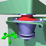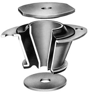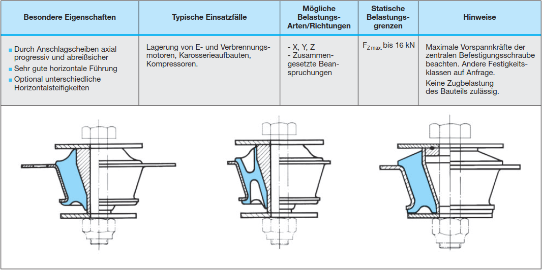 Durch die über dem Konus liegende Anschlagplatte, die sich bei übergroßen Kräften in Druckrichtung auf den oberen Gummiwulst legt, können axiale Stoßkräfte progressiv abgefangen werden.