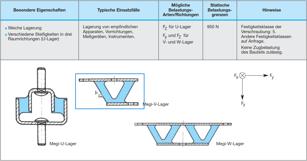 Megi-V-W-Teile finden ein vielseitiges Verwendungsfeld bei der Lagerung von empfindlichen Instrumenten, Meß- und Anzeigegeräten, die gegen Erschütterungen zu schützen sind.