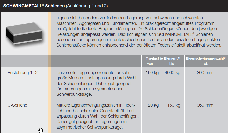 Schwingmetall® Schienen eignen sich besonders zur federnden Lagerung von schweren und schwersten Maschinen, Aggregaten und Fundamenten. Ein praxisgerecht abgestuftes Programm ermöglicht individuelle Programmlösungen.