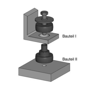Das zu lagernde Bauteil I (oben) sitzt mit einer passenden Bohrung auf dem gekröpften Unterteil des U-Mount. Die Verbindung mit Bauteil II wird durch das Aufsetzen des Oberteils des U-Mount hergestellt. Eine zentrale Verschraubung presst beide Teile des U-Mount zusammen, deren Festigkeit bestimmt die Festigkeit der Gesamtverbindung.