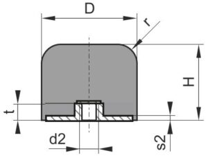 Kranpuffer aus Gummi Typ GP-1I haben eine zylindrische Grundplatte aus Stahl mit 1 Innengewinde zur Befestigung auf dem Grund. Auf dieser Grundplatte ist ein zylindrischer Gummikörper vulkanisiert.