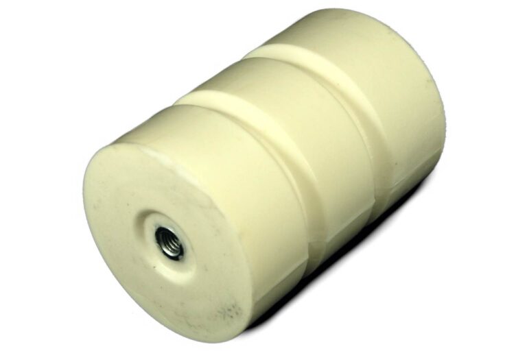 Kranpuffer aus zelligem Polyurethan Typ ZP-1I haben ein Metall mit integriertem Innengewinde zur Befestigung auf dem Grund. Auf diesem ist ein zylindrischer Körper aus zelligem Polyurethan vulkanisiert.