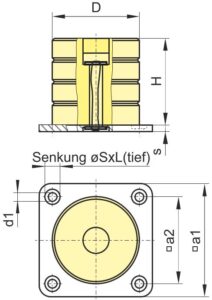 Kranpuffer aus zelligem Polyurethan Typ ZP-QP haben eine quadratische Grundplatte aus Stahl, Kunststoff oder Aluminium mit 4 Bohrungen zur Befestigung auf dem Grund. Auf dieser Grundplatte ist ein zylindrischer Körper aus zelligem Polyurethan vulkanisiert.