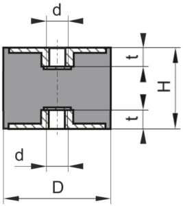 Gummipuffer Typ CZ mit beidseitigem Innengewinde bestehen aus 2 Metallen mit Innengewinde, zwischen denen ein zylindrischer Gummi einvulkanisiert ist.